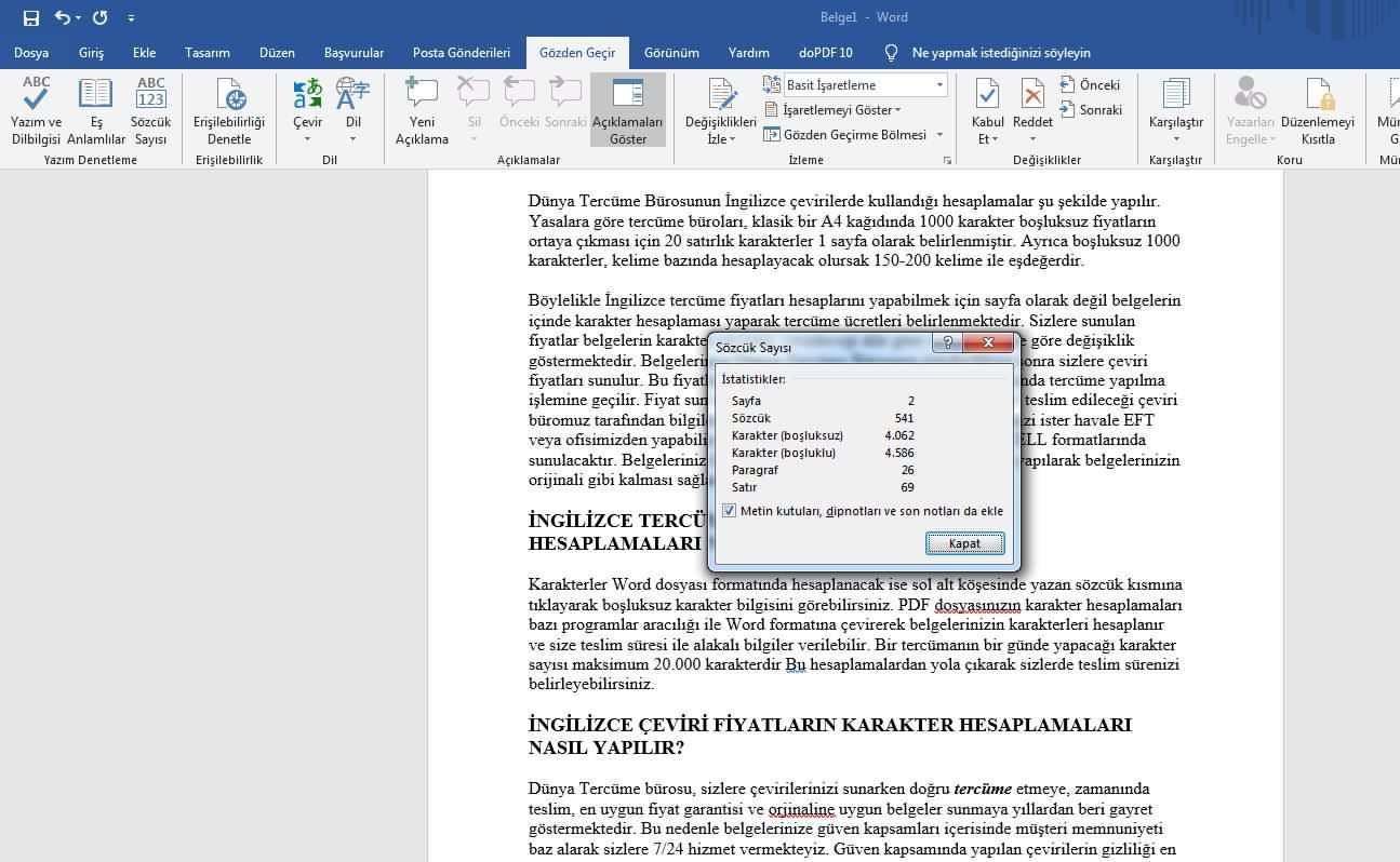 Karakterler Word dosyası formatında hesaplanacak ise sol alt köşesinde yazan sözcük kısmına tıklayarak boşluksuz karakter bilgisini görebilirsiniz. PDF dosyasının karakter hesaplamaları bazı programlar aracılığı ile Word formatına çevirerek belgelerinizin karakterleri hesaplanır ve size teslim süresi ile alakalı bilgiler verilebilir. Bir tercümanın bir günde yapacağı karakter sayısı maksimum 20.000 karakterdir. Bu hesaplamalardan yola çıkarak sizlerde teslim sürenizi belirleyebilirsiniz.